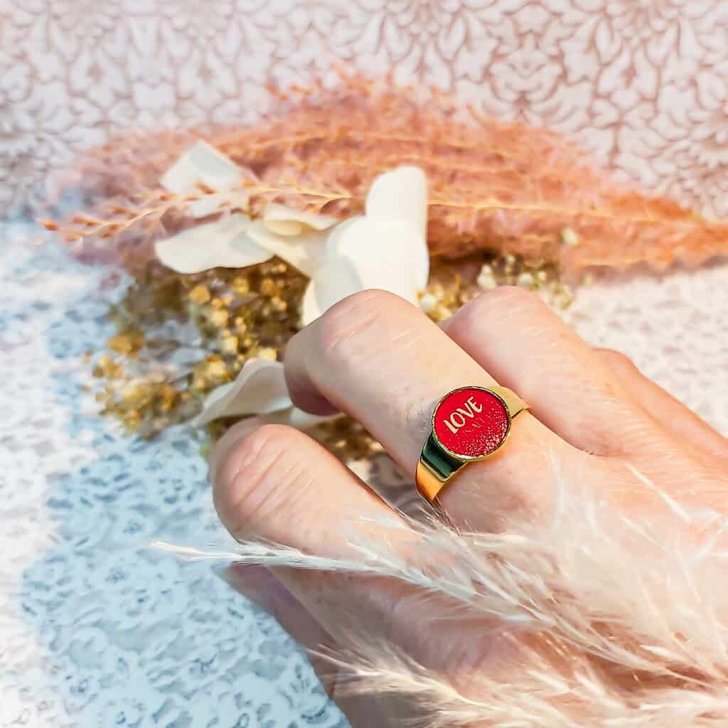 - Couleur : doré, rouge orangé, message "love"
