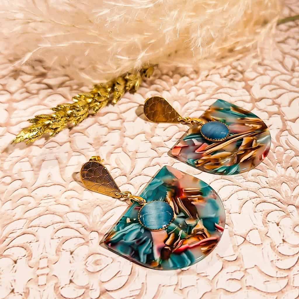 Chaque paire est soigneusement confectionnée à la main en France, en petites séries. Les motifs colorés, imprimés sur papier photo et sublimés par de la résine coulée en fines couches, sont associés à des pendentifs en acétate marbré aux formes de demi-lune. Résultat ? Une création unique, pleine de caractère et d’originalité.