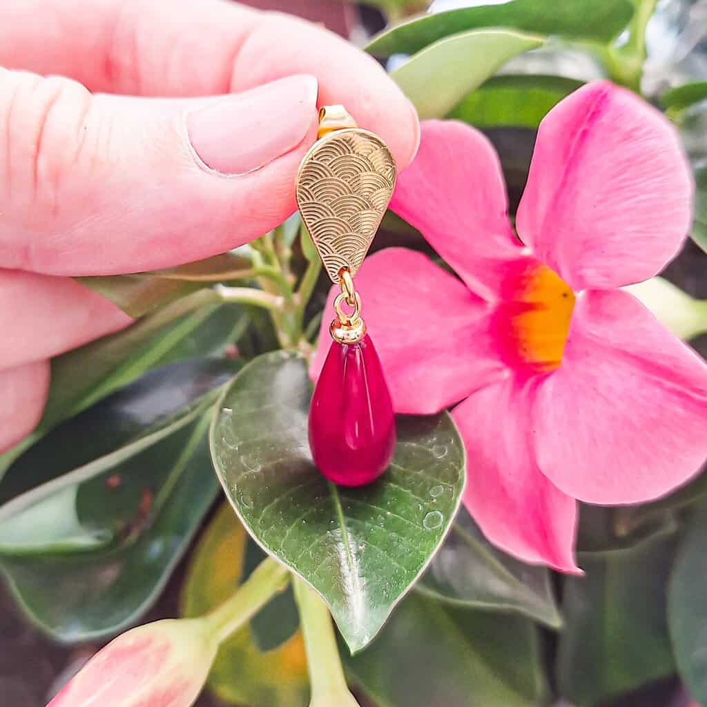 avec motif vagues japonaises doré, ornées de perles goutte bleue, rose framboise ou verte.