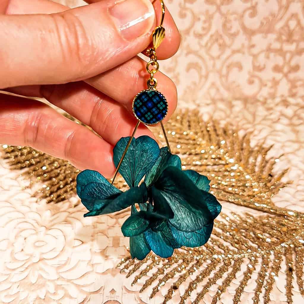 - Résine et Fleurs Stabilisées : Un design original en résine, agrémenté de fleurs d’hortensias stabilisées.