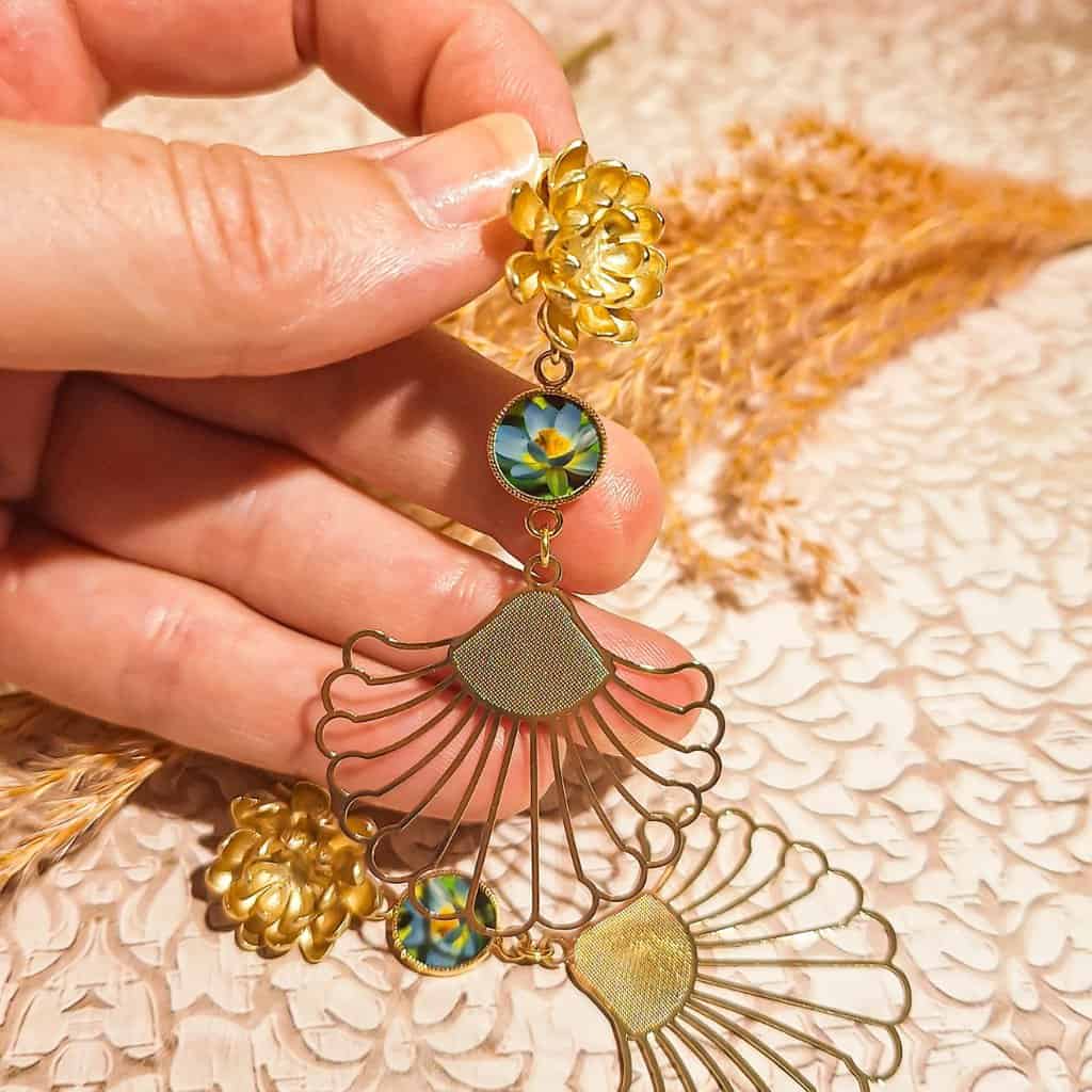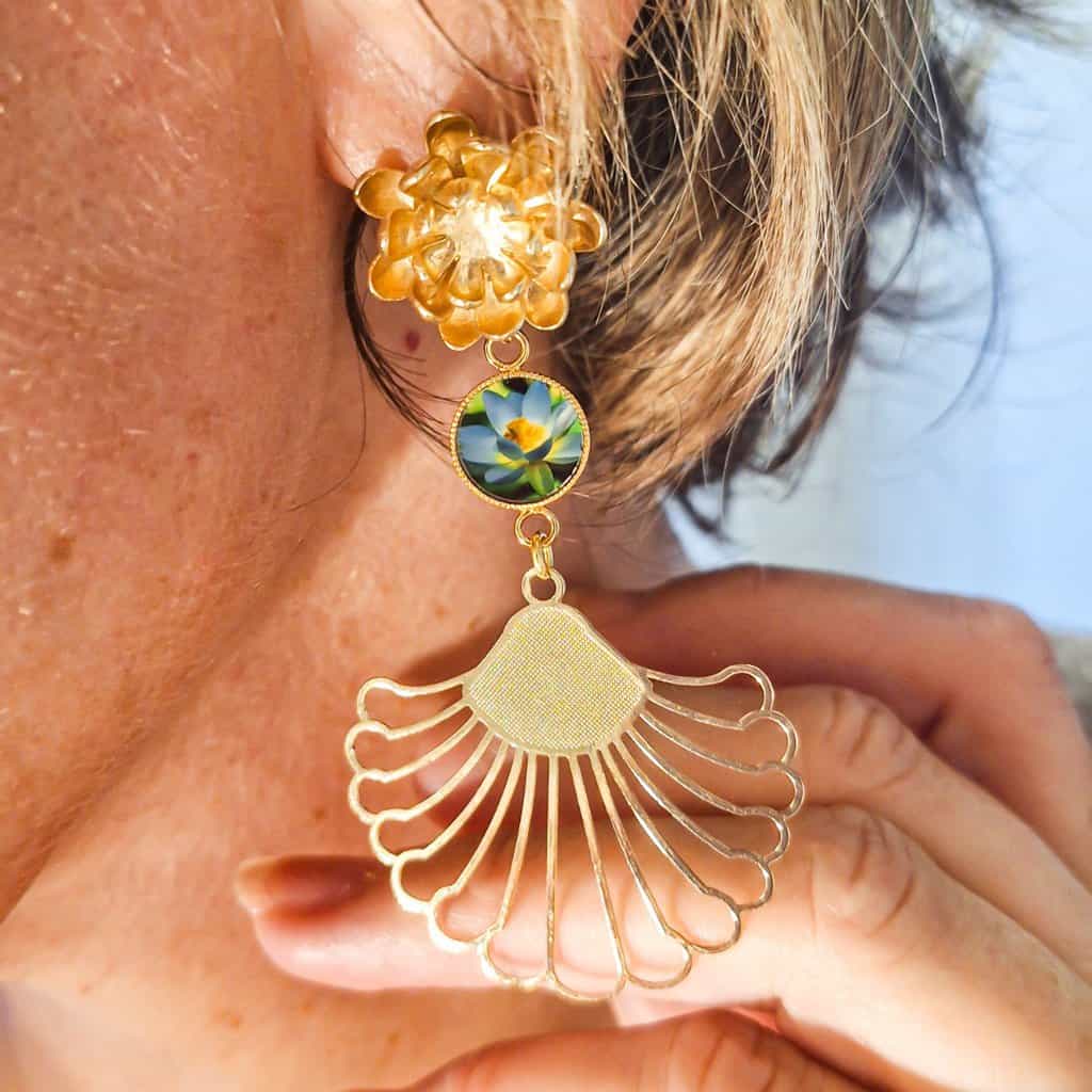 Entre lotus délicat et feuilles tropicales dorées, ces boucles faites main en France