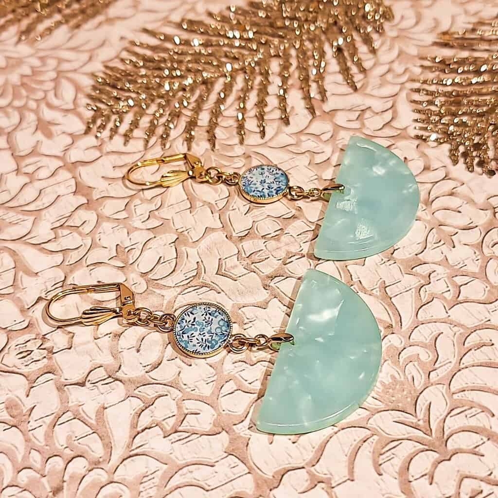 Boucles d’oreilles fleurs bleues avec motif nature.