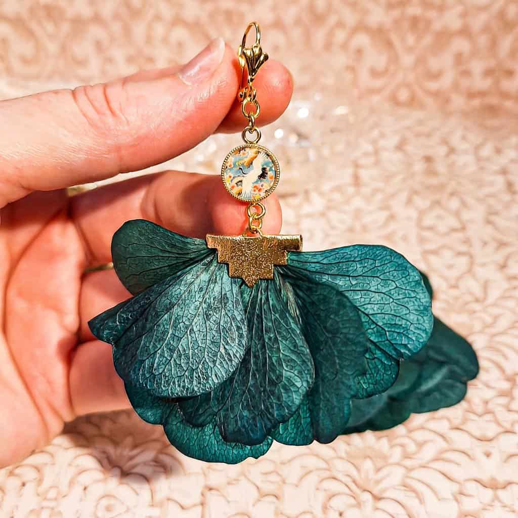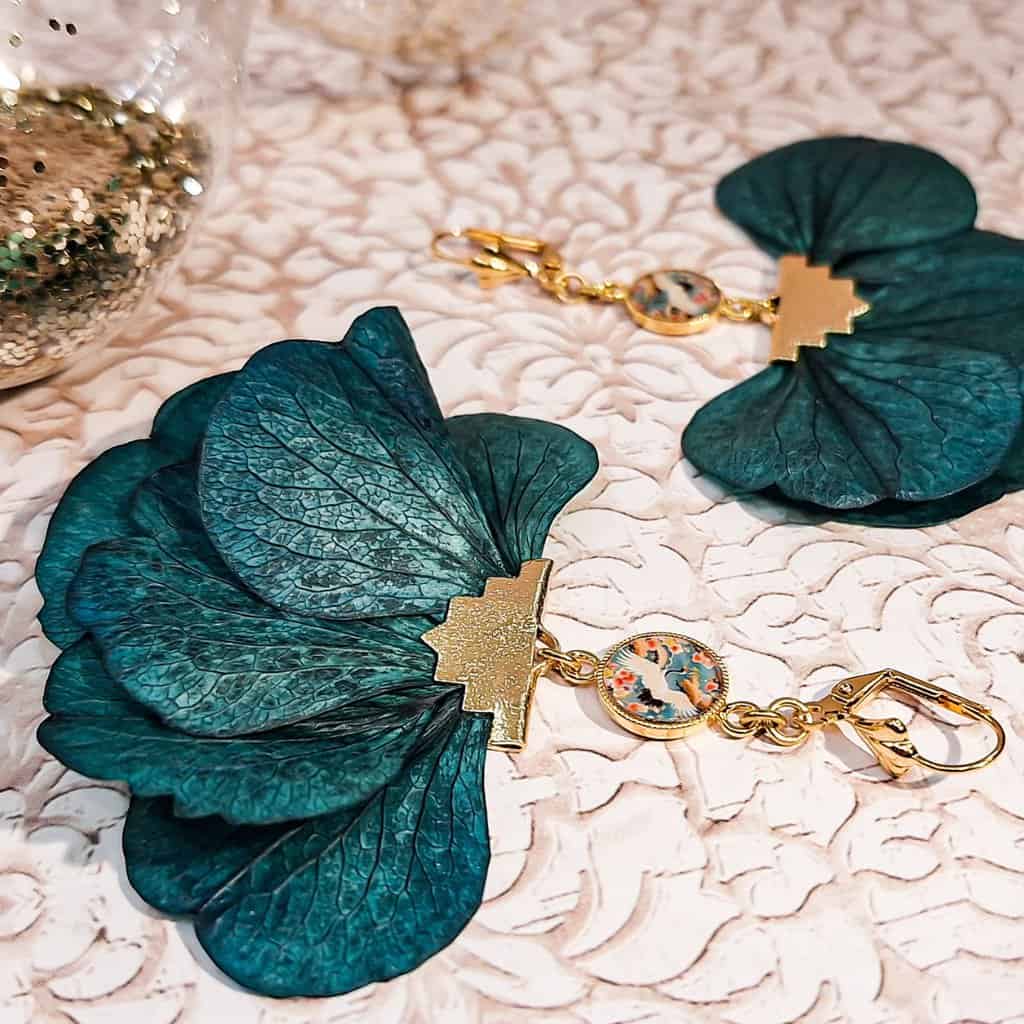 Une grue japonaise s’envole parmi de véritables pétales d’hortensia vert émeraude. Résultat : une paire bohème chic, élégante, pleine de douceur et de poésie, qui sublime vos tenues du quotidien ou de fête.