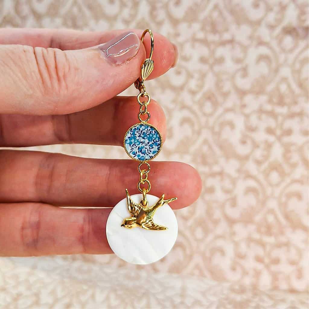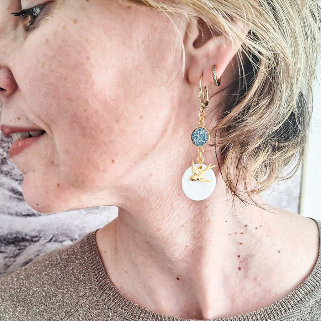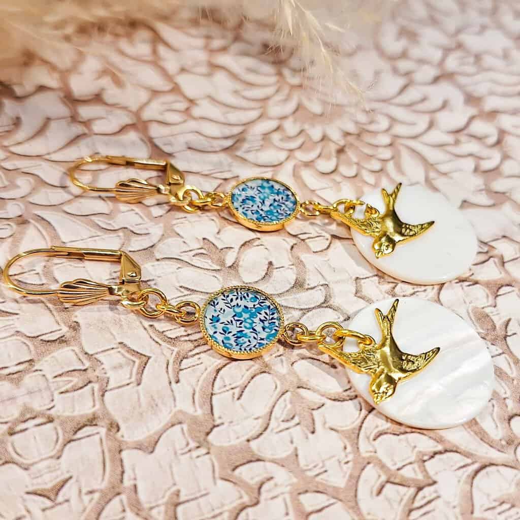 Pour ces boucles oiseau, une belle hirondelle virevolte au gré du vent et des saisons, libre comme l'air. Empreint d'originalité, c'est un modèle inclassable qui vous accompagnera au quotidien : à la fois chic, un soupçon bohème, une tendance naturelle, ces boucles en nacre et résine seront parfaites pour mettre en lumière les pièces de votre dressing.