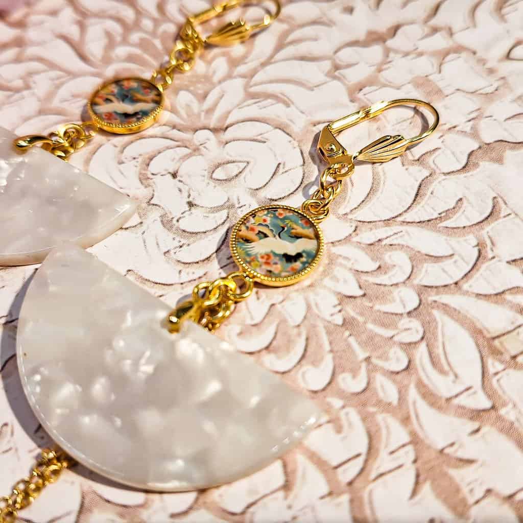 Adepte du style bohème chic? Ces boucles d'oreilles oiseau japonais seront parfaites pour sublimer vos tenues! Raffinées, discrètes, tout en légèreté et originalité, elles ne vous quitteront plus! Au motif? une belle grue, symbole du bonheur au Japon, imprimée sur papier photo résiné par mes soins. En journée en soirée, vous pouvez les combiner avec différentes tenues. Un incontournable dans votre boite à bijoux sublimer vos looks! Toutes nos pièces sont proposés en édition limitée, quant elles ne sont pas uniques. La confection est fait main en France, avec amour!