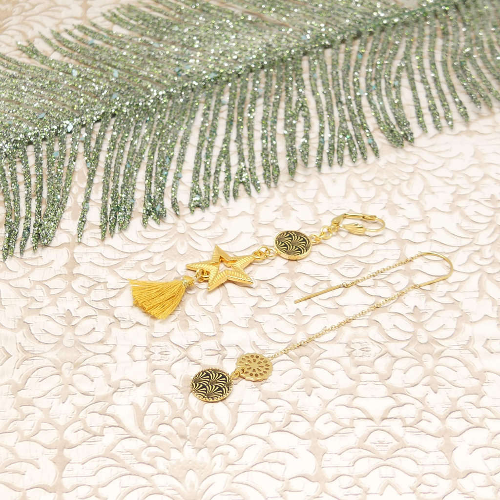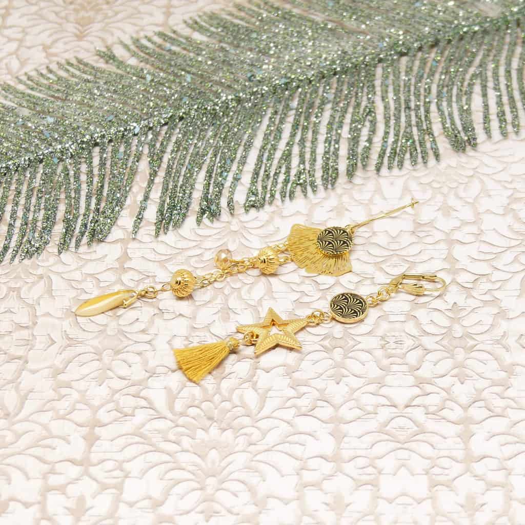 Le montage est fait-main avec des apprêts de qualité, sans nickel. Les matériaux privilégiés sont en laiton doré or ou bronze ou en acier inoxydable.