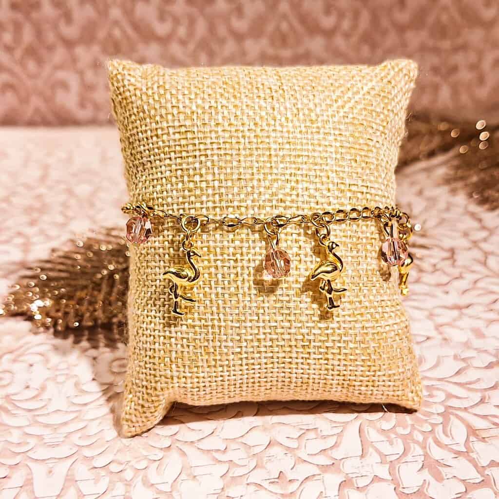 Bracelet Flamingo Rose : Découvrez ce bijou raffiné orné de breloques flamant rose, pampilles dorées et perles Swarovski scintillantes. Parfait pour une touche exotique et élégante, ce bracelet est fabriqué à la main en France et est idéal pour un cadeau unique.