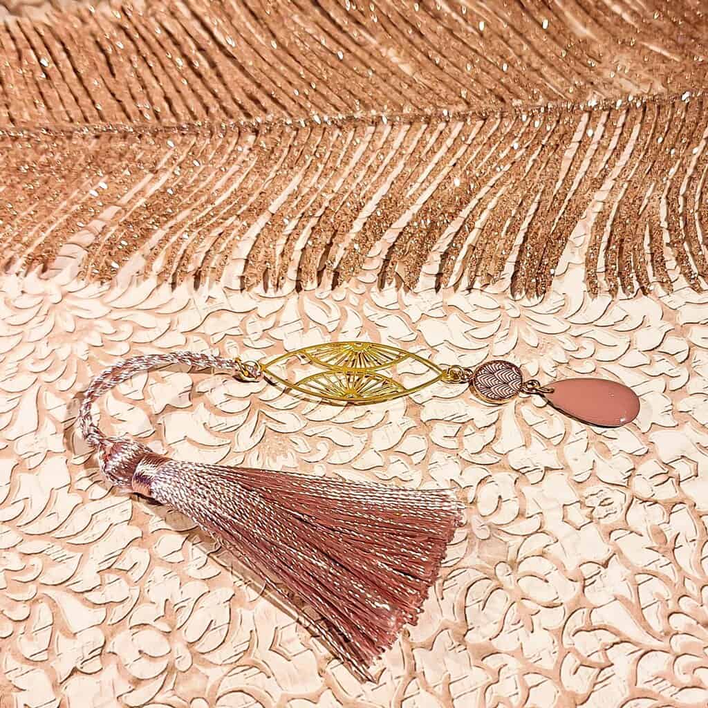 ☼ Une estampe bohème ovale et des pampilles : pompon textile 7 cm, sequin goutte 2 cm.