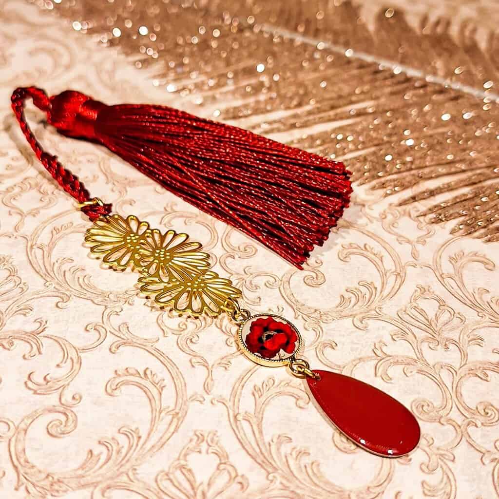 ☼ Estampe bohème fleur 3 cm, pompon textile 8 cm, sequin goutte.