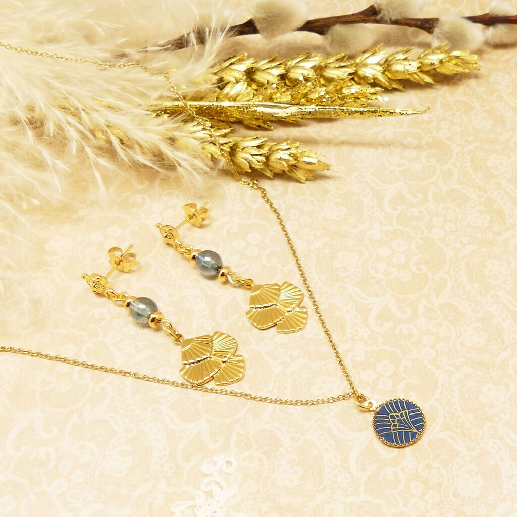 Un collier et une paire de boucles d'oreilles composent ce coffret aux allures rétros. Tous deux sont parés de pimpants pendants décorés d'arabesques..