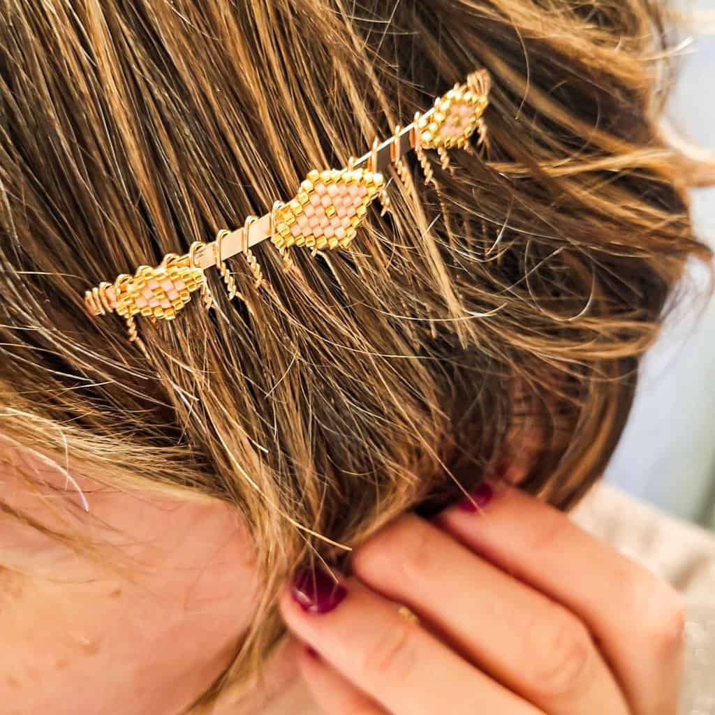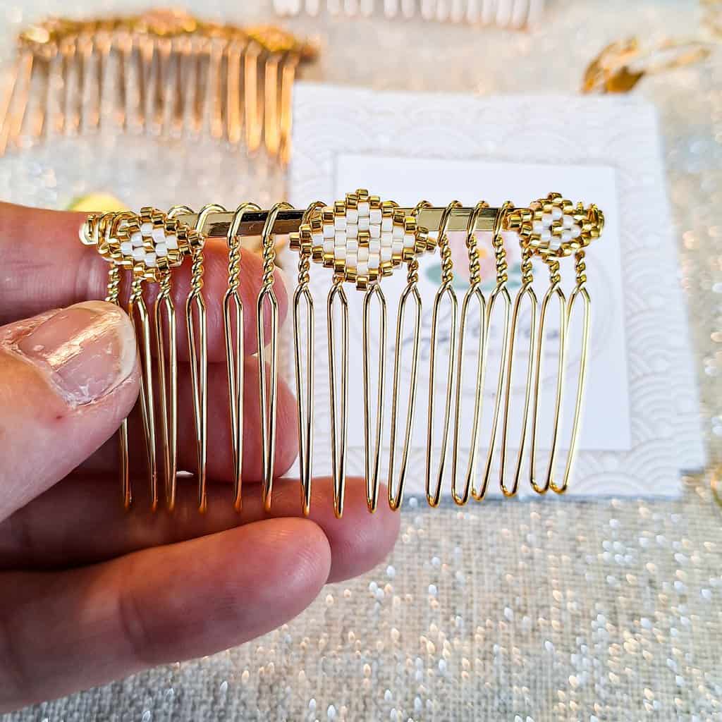 Réalisé avec des perles japonaises, ce peigne est idéal pour ajouter une touche bohème chic à vos coiffures.